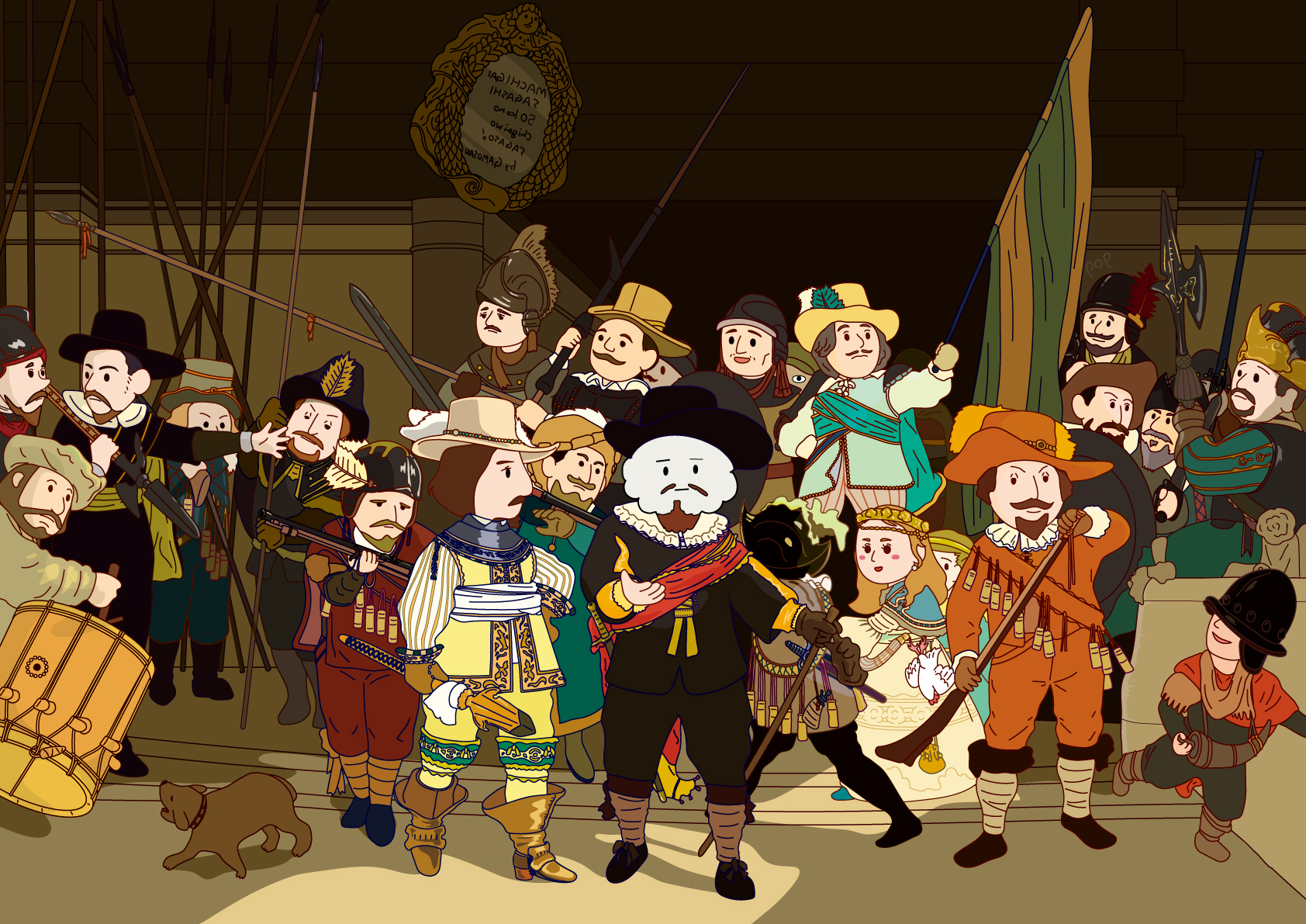 レンブラントの「夜警」をモチーフにしたイラストです